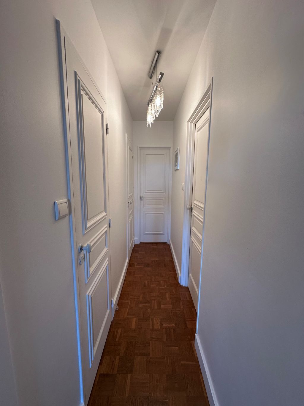 Rénovation de notre couloir avec parquet en point de Hongrie. Résultat élégant et lumineux. Portes panelées et éclairage LED modernes. Équipe professionnelle, parfait