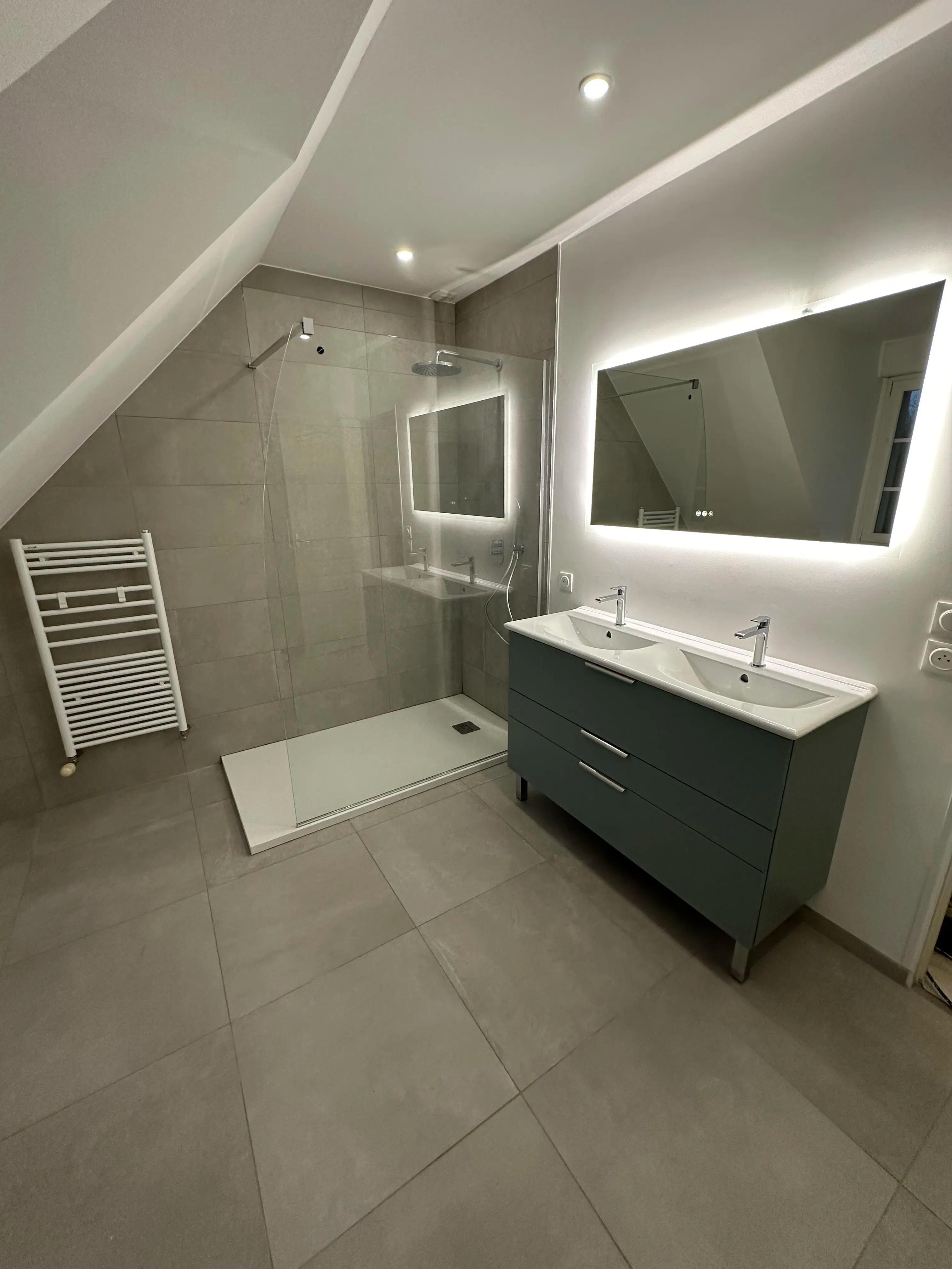Transformation complète de notre salle de bain en espace zen. Douche à l'italienne et carrelages magnifiques. Travail soigné, équipe réactive. Résultat au-delà de nos attentes. Merci !